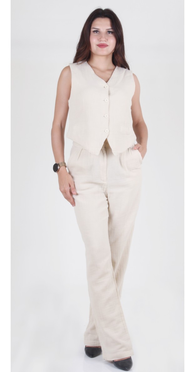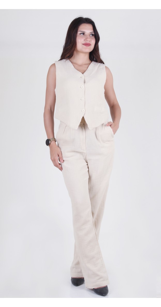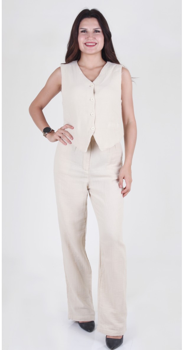 Taş rengi pantolon yelek takım. Altı üstünü farkı kıyafetlerinizle de kombinleyebilirsiniz.